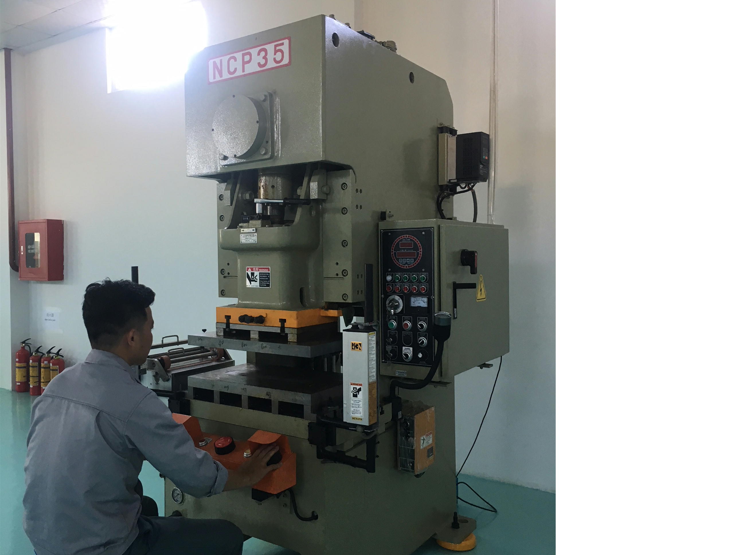 こちらは中型の連続プレス機です。材料送り装置がついて居るため、無人で作業を行うことができます。