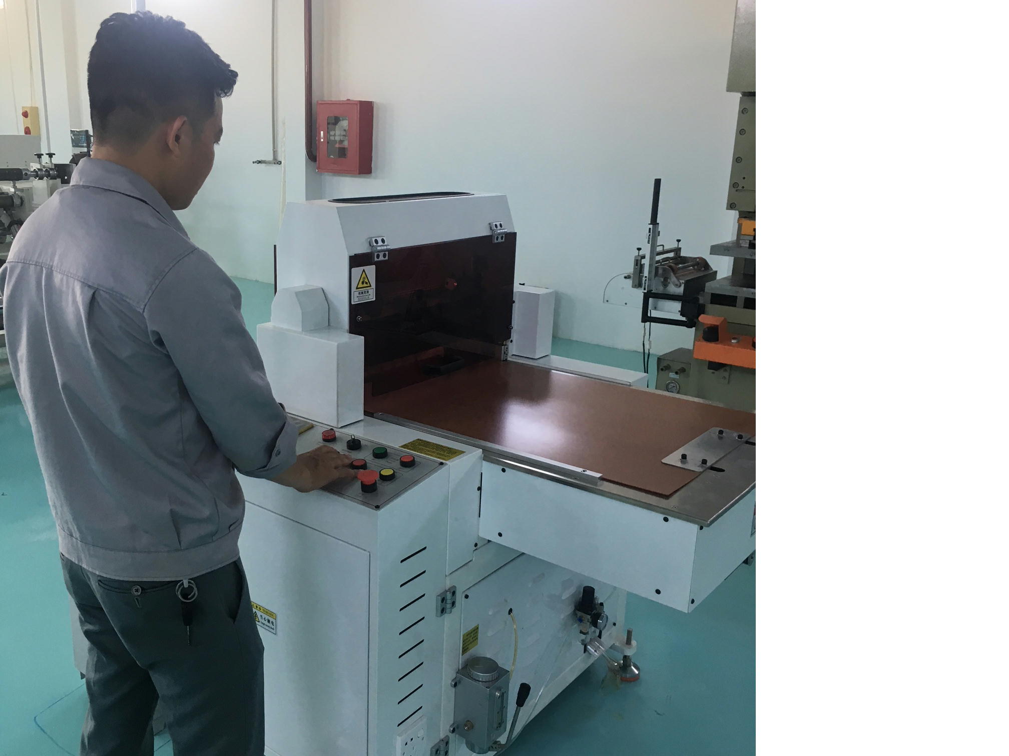 NC裁断機です。決められたピッチ毎に型が上下し、1つの型で1つのシートを連続加工できます。まさに万能タイプのプレス機です。