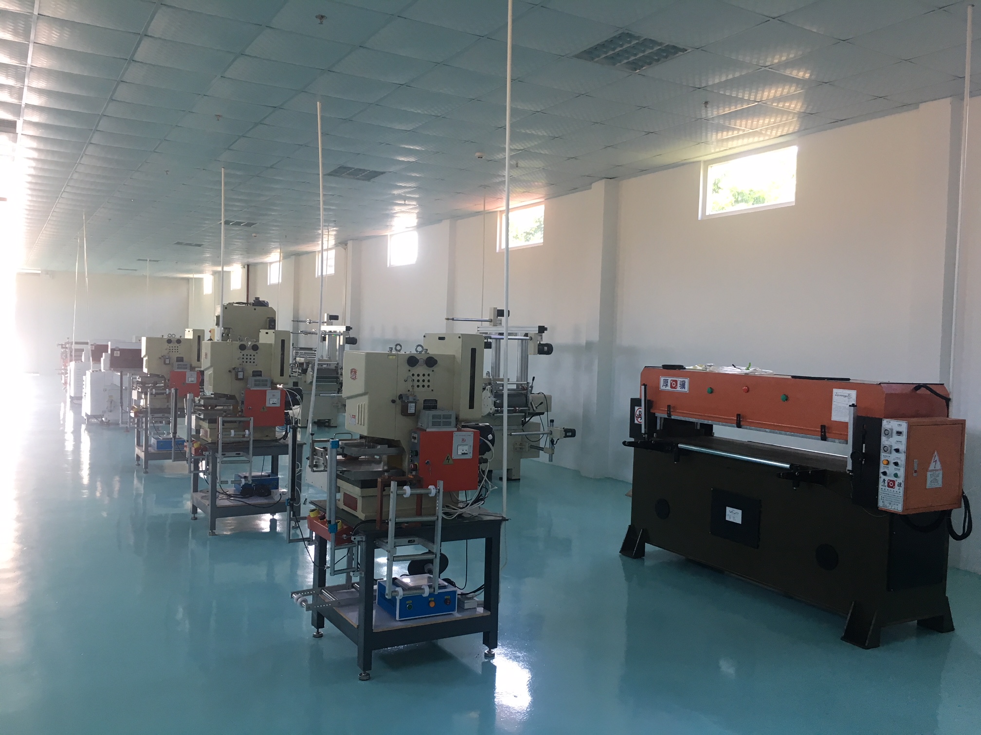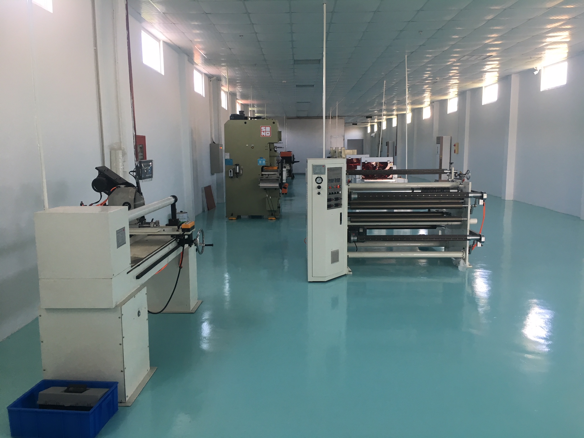 手前に見えますのがスリット機、中央に見えますのがラミネート機です。ロール材のスリットから両面テープなどの張り合わせまで、製品に合わせたベストなサイズで無駄なく加工します。