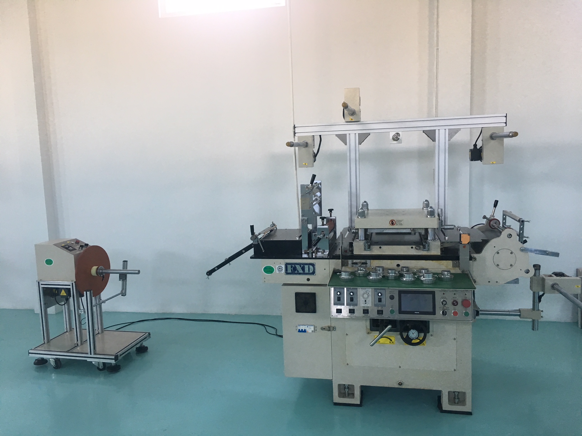 スリットされたロール材をプレス・カス取り・巻き上げまでできる機械です。主に両面テープのハーフカット加工で重宝されます。